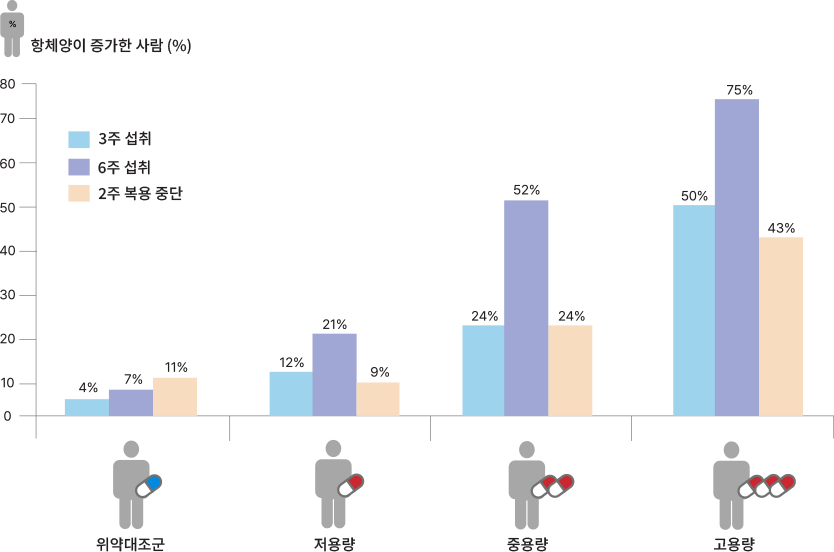 - 건강한 성인 140명을 대상으로 코릭스를 6주간 투여했을 때 TFα IgM 항체가 증가함을 확인하였으며, 2주간 섭취를 중단하면 TFα IgM 항체가 감소함을 확인하였습니다.