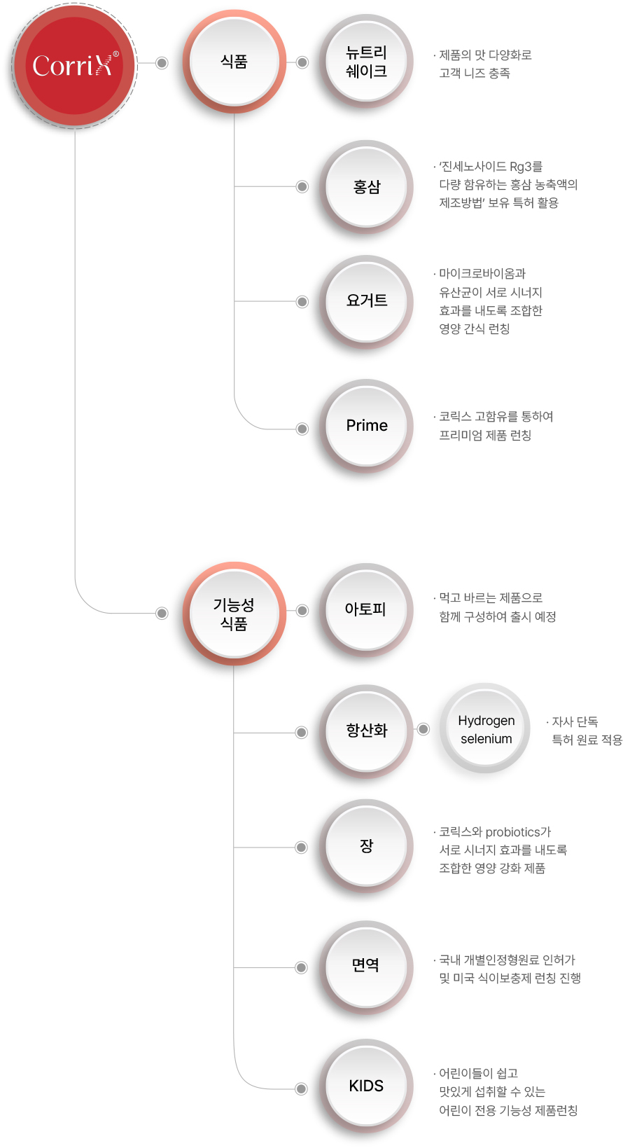 코릭스는 식품과 건강기능식품 분야에서 다양한 제품 런칭을 추진하고 있습니다.